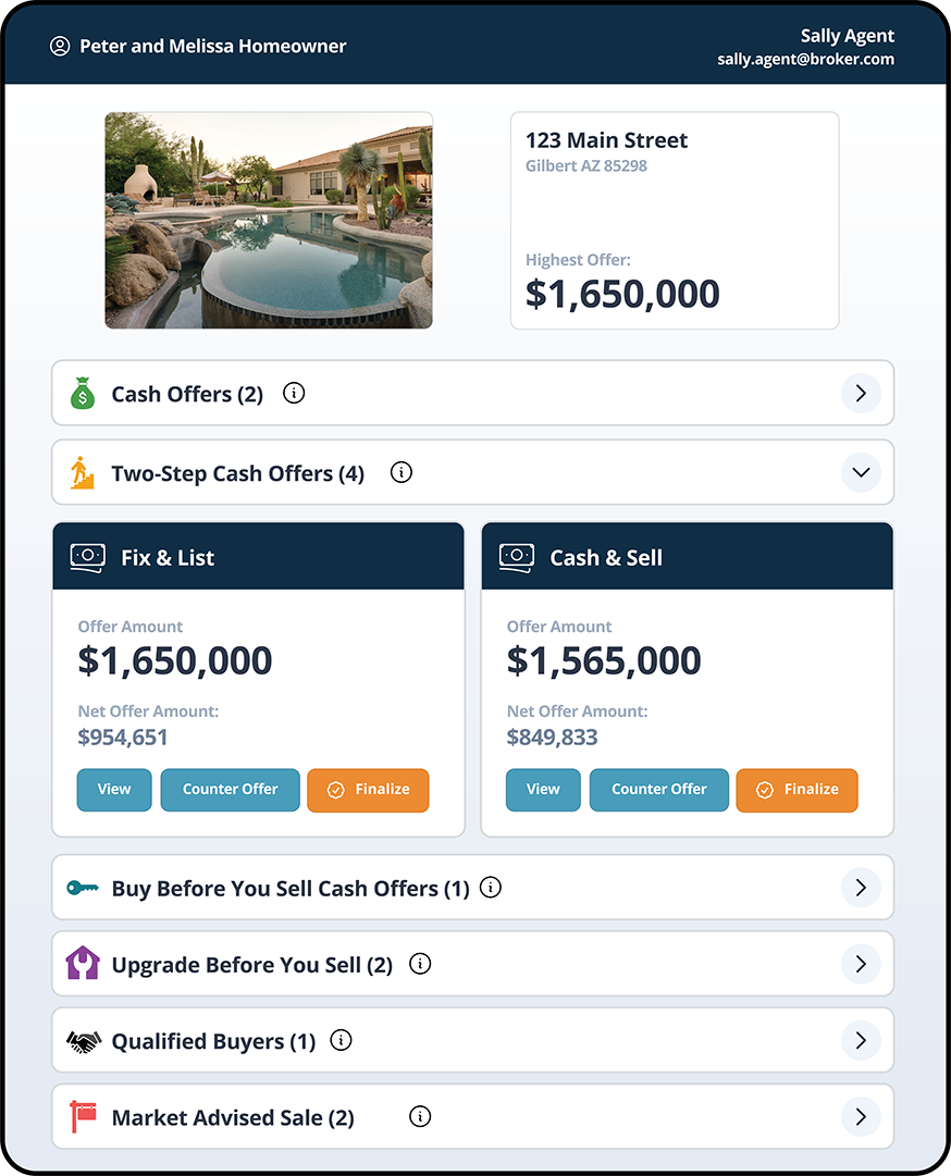 Cement yourself as the agent they choose by being the first one they reach and the only one with comprehensive options for both cash offers and listing options. You can showcase the unique value you provide whether the seller chooses to list with you through a Market Advised Sale or to accept one of the cash programs.